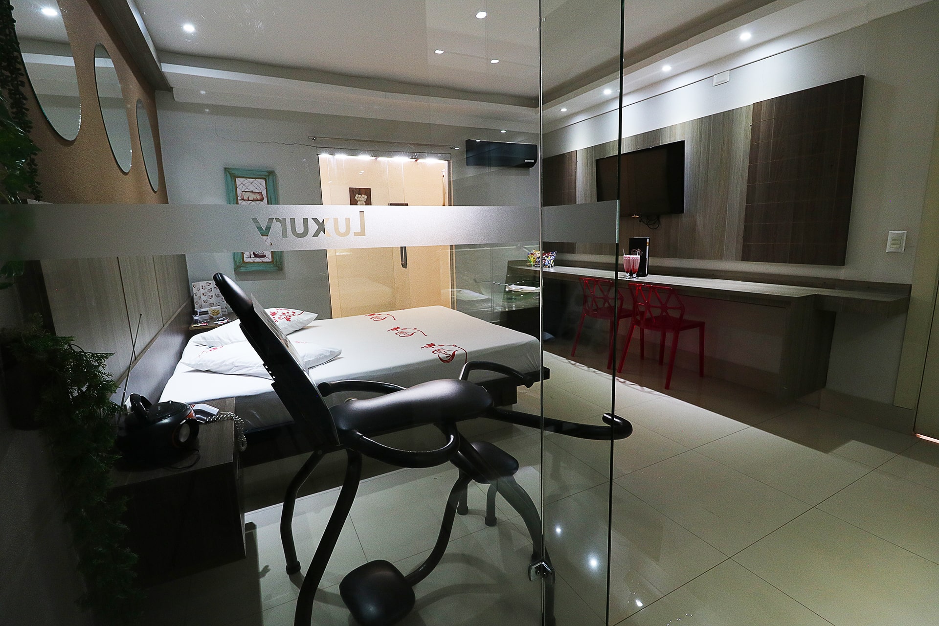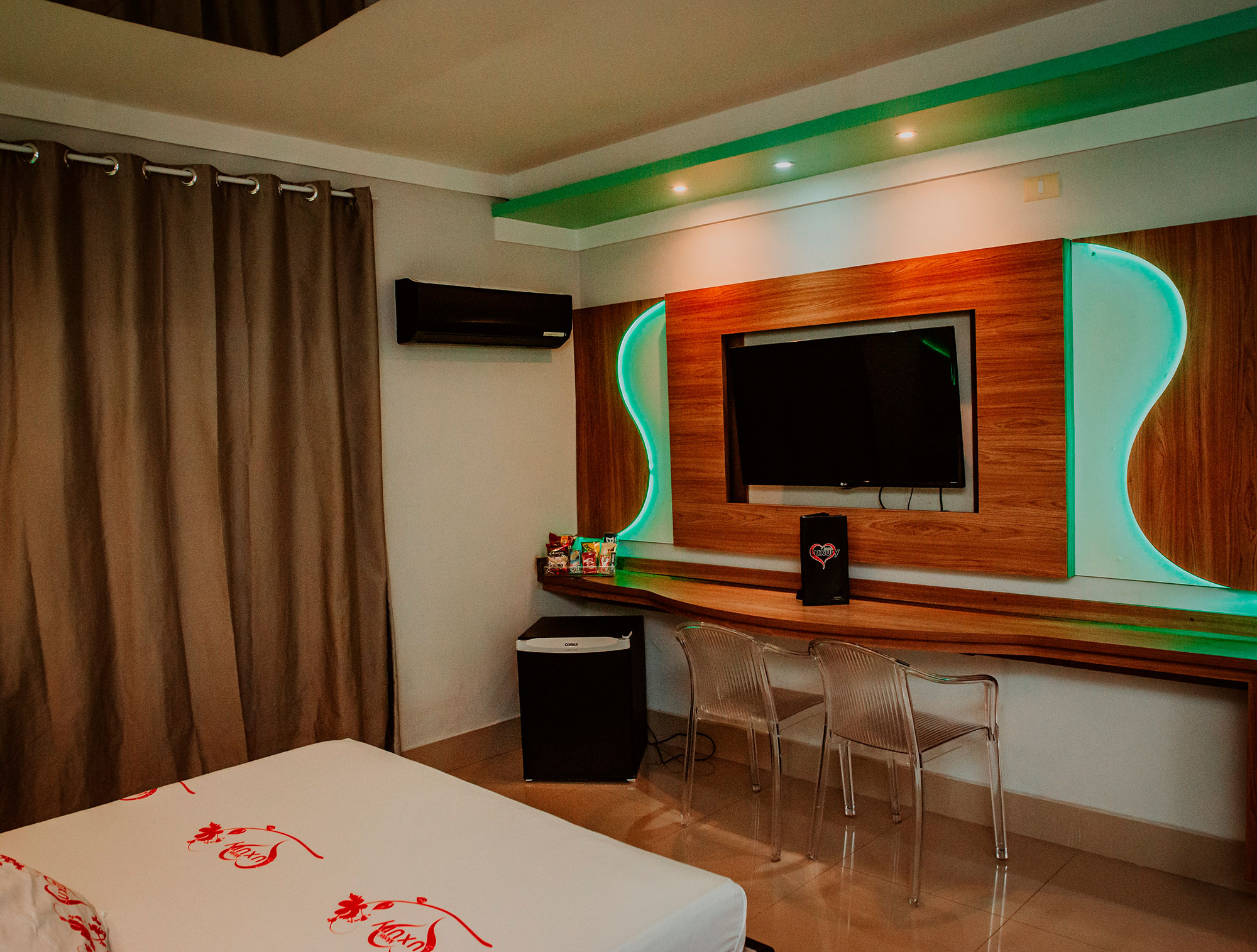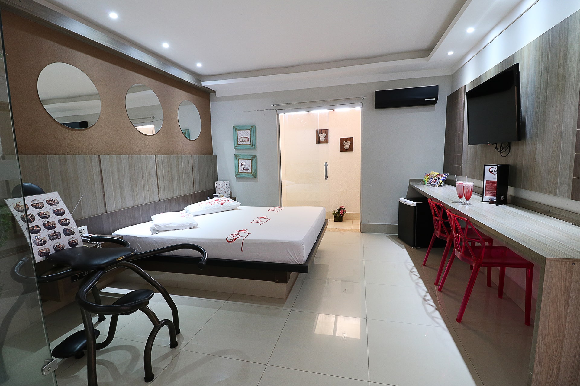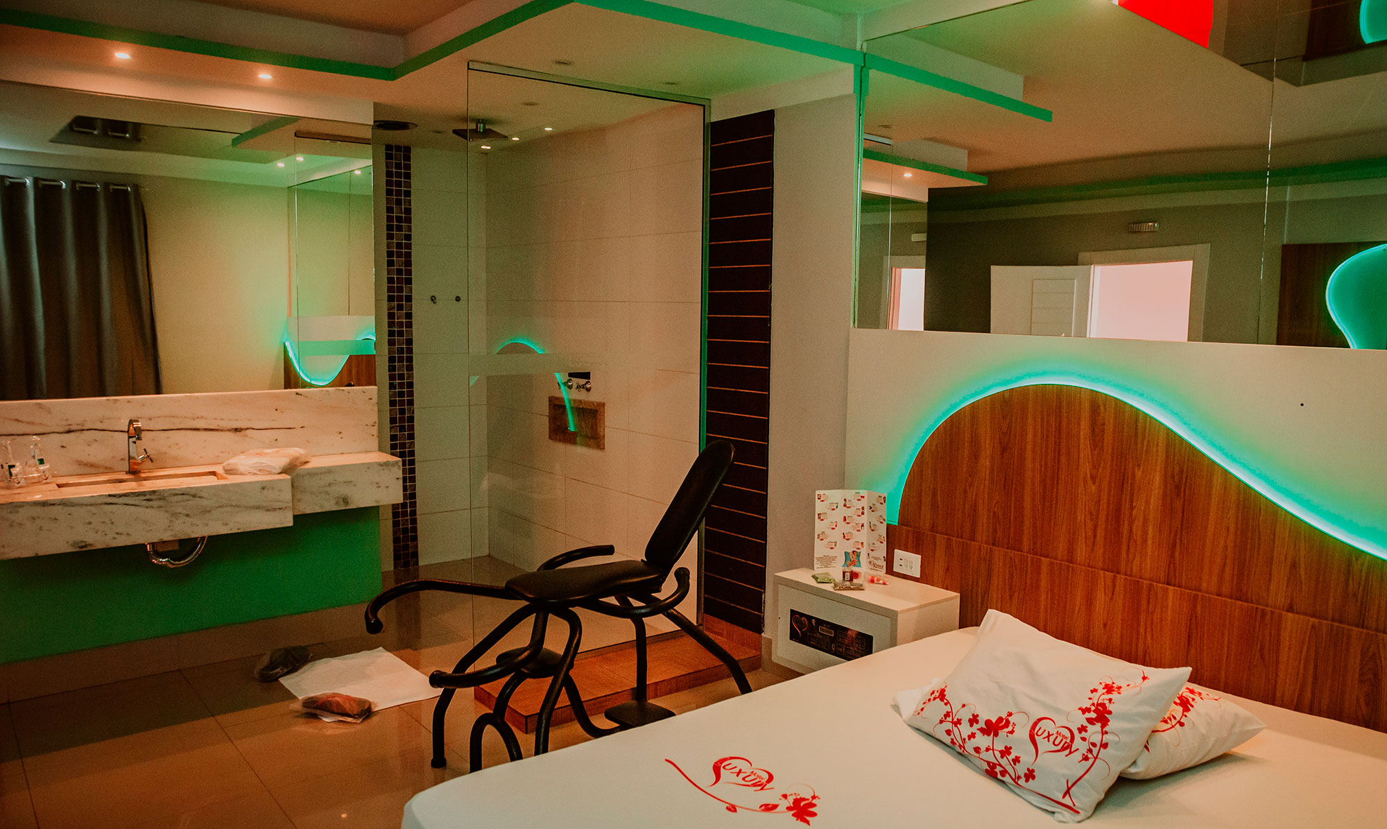 2 Canais eróticos, poltrona erótica, Ar condicionado split, TV LCD 42″, Frigobar, Som ambiente e garagem privativa.