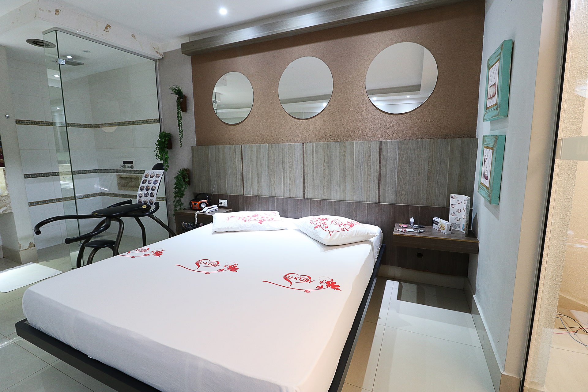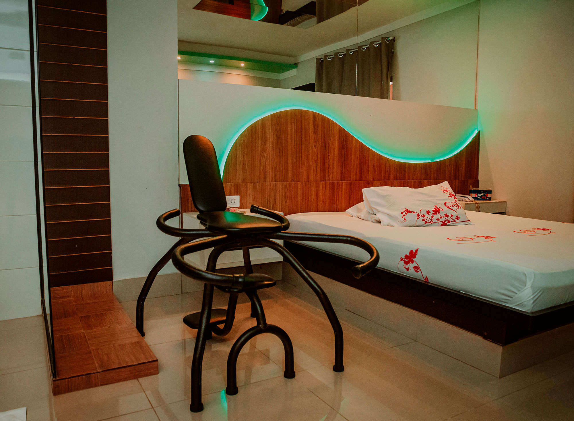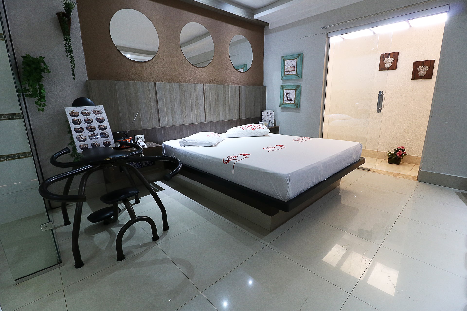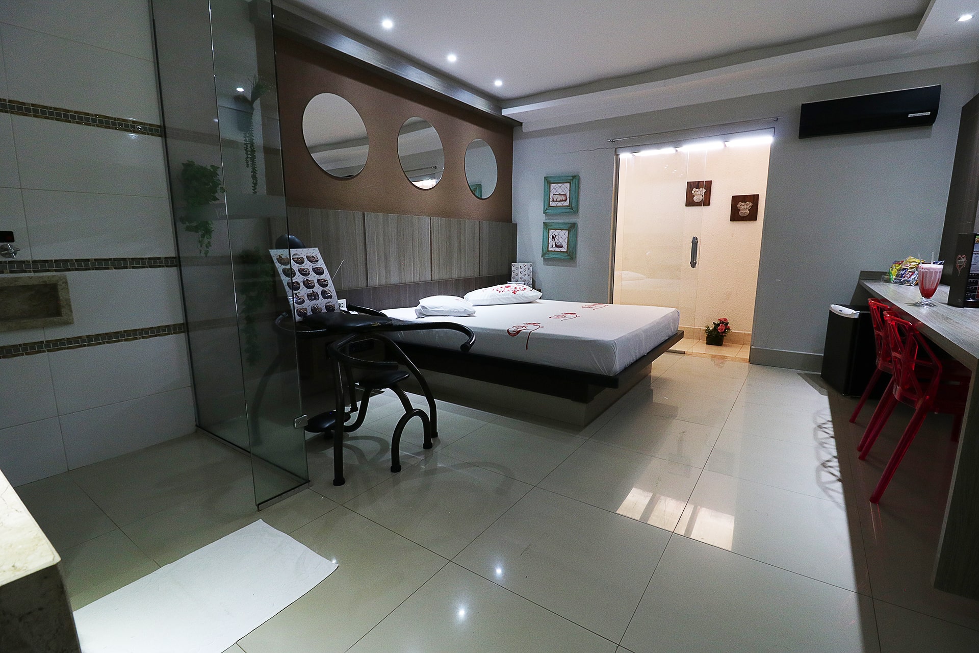 2 Canais eróticos, poltrona erótica, Ar condicionado split, TV LCD 42″, Frigobar, Som ambiente e garagem privativa.