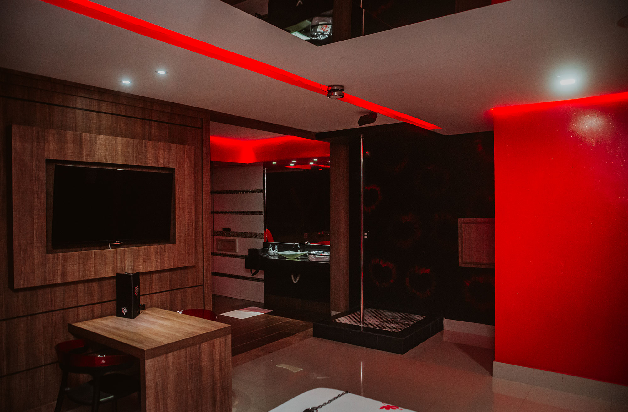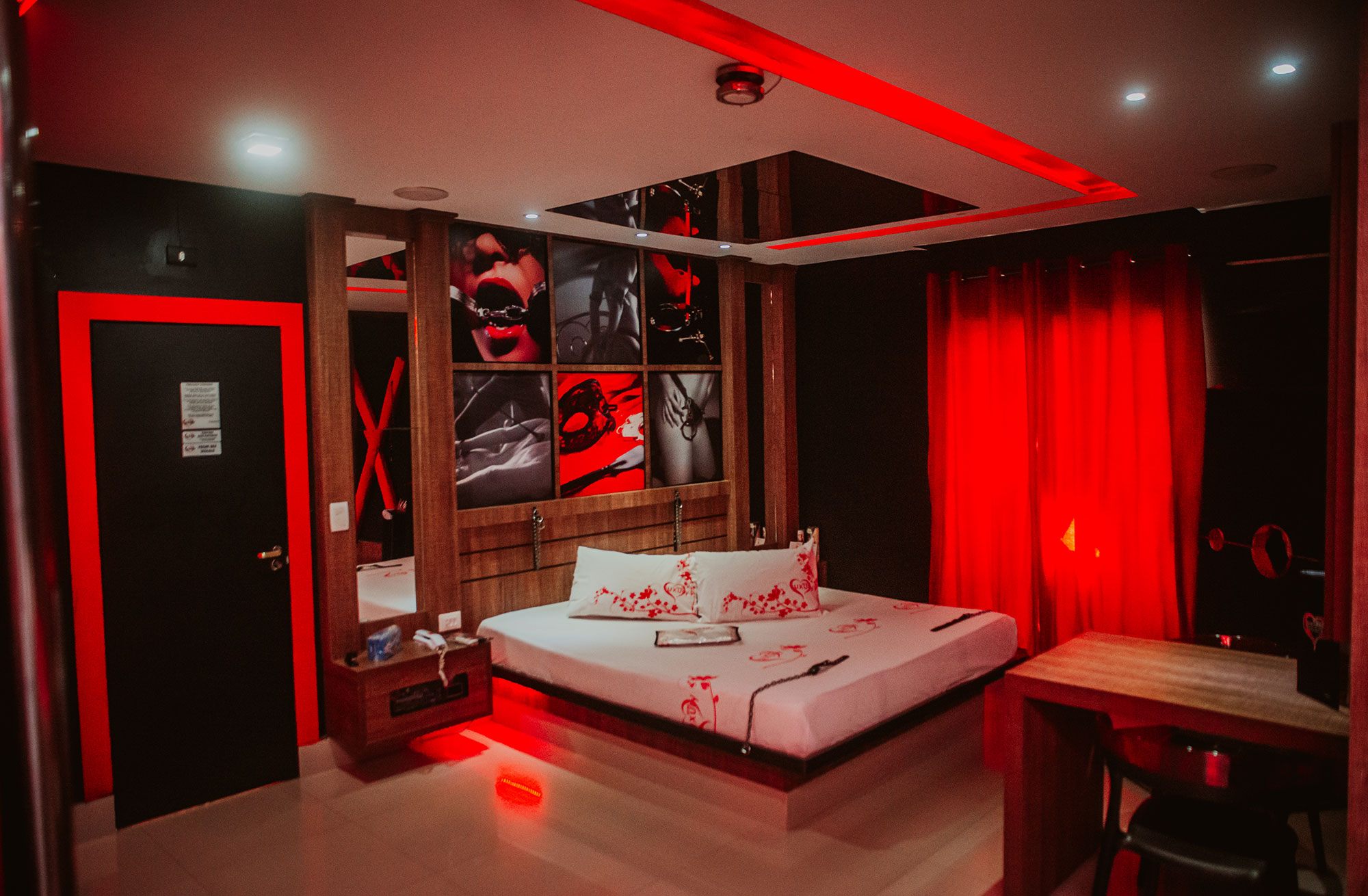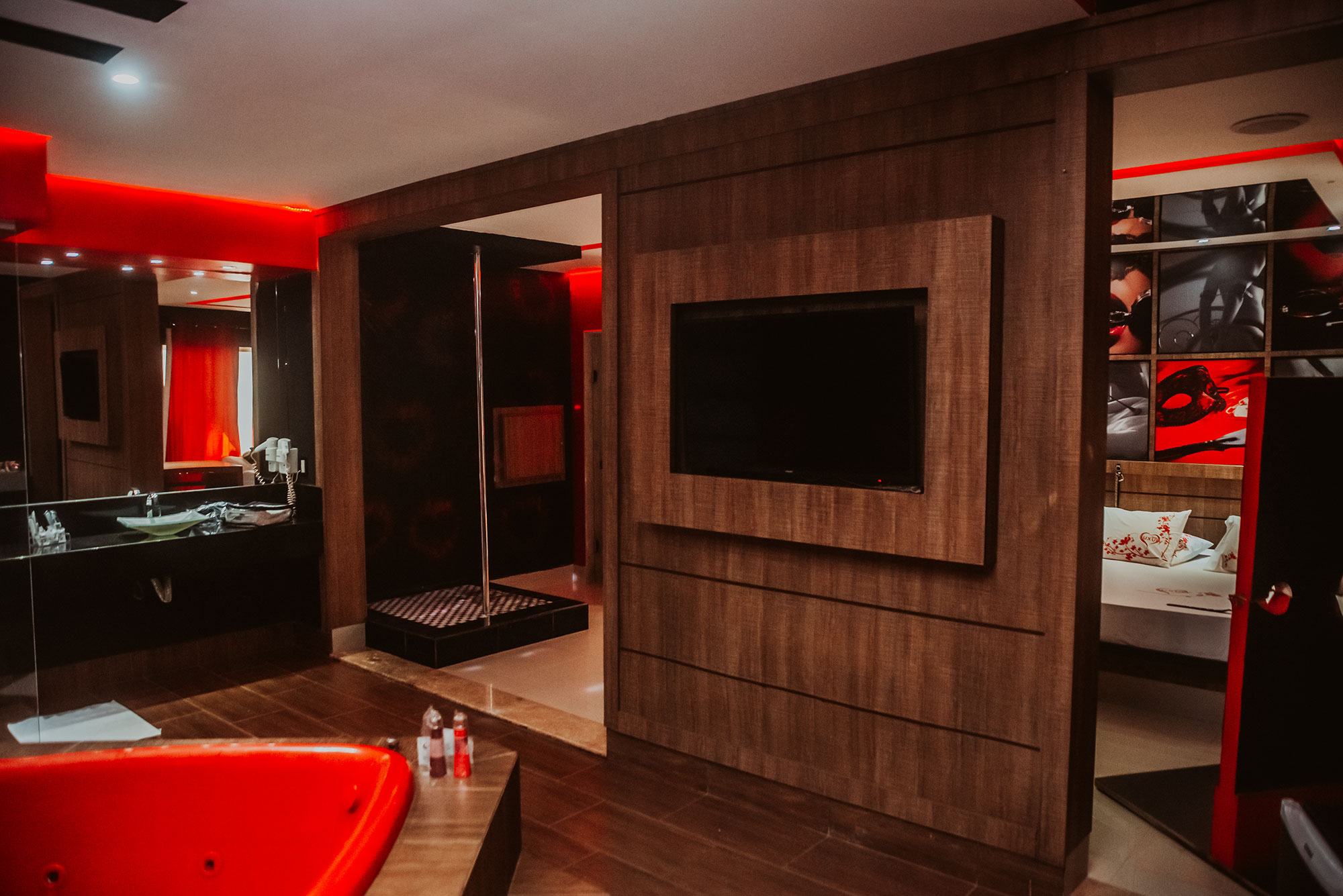 2 Canais eróticos, Decoração temática erotica com poltrona erótica e “X” erotico, Ar condicionado split, 2 TVs Smart″, Frigobar, Som com bluetooth, Hidromassagem em formato de coração.